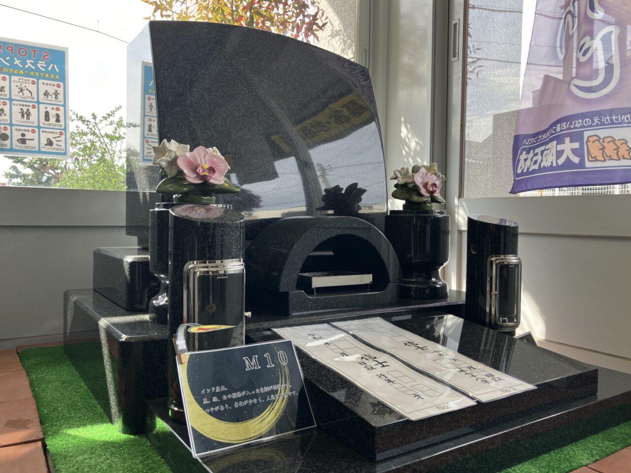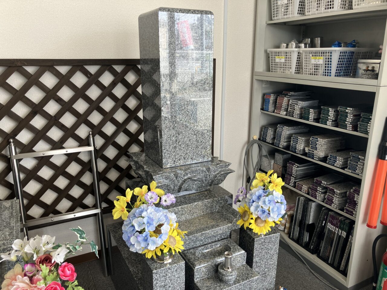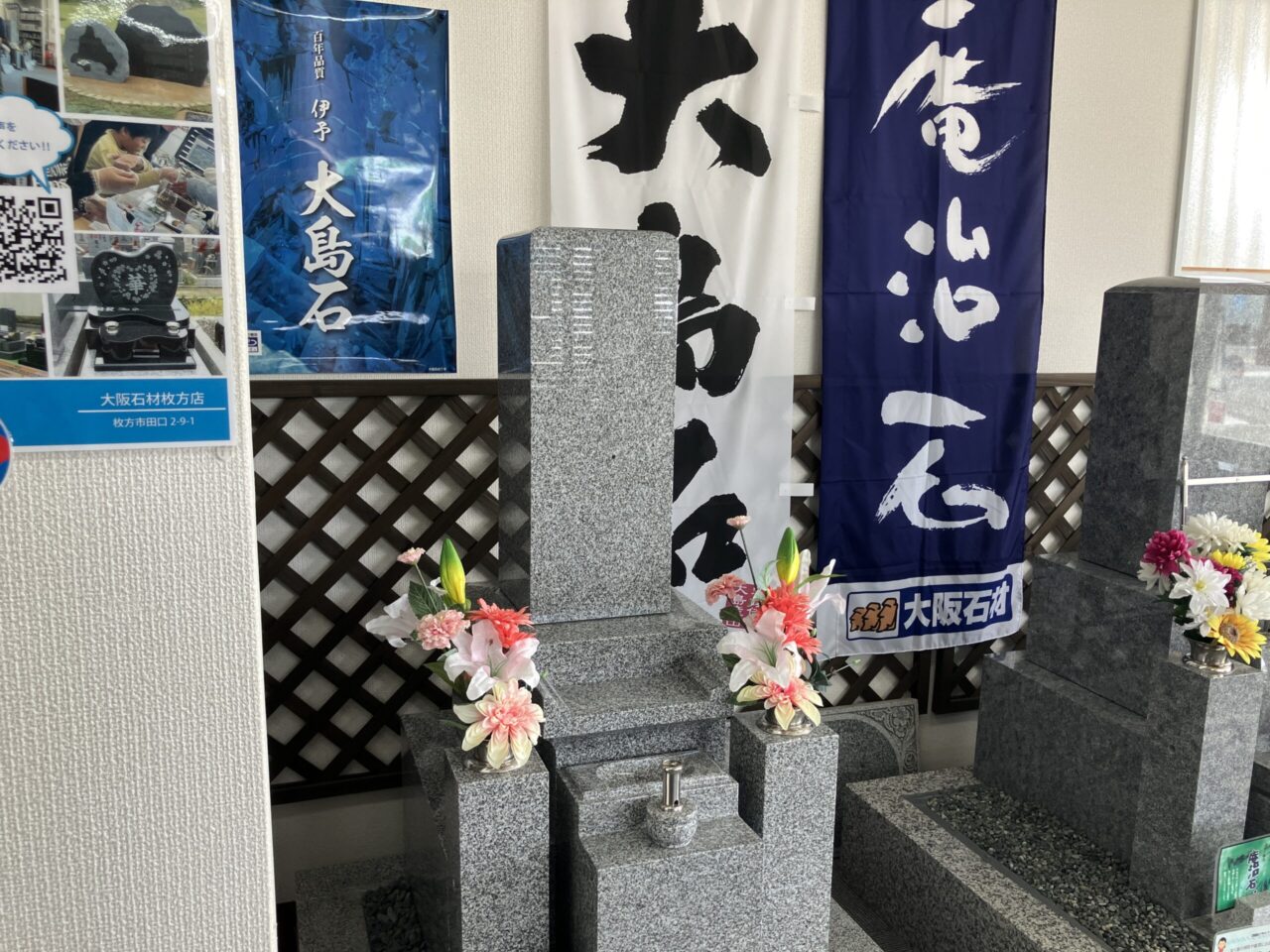 大阪石材は東大阪にある本社以外にも7箇所の拠点があり、ほとんどの店舗で墓石の現品を展示しているのですが、今回は枚方店の現品墓石をご紹介させていただきます。