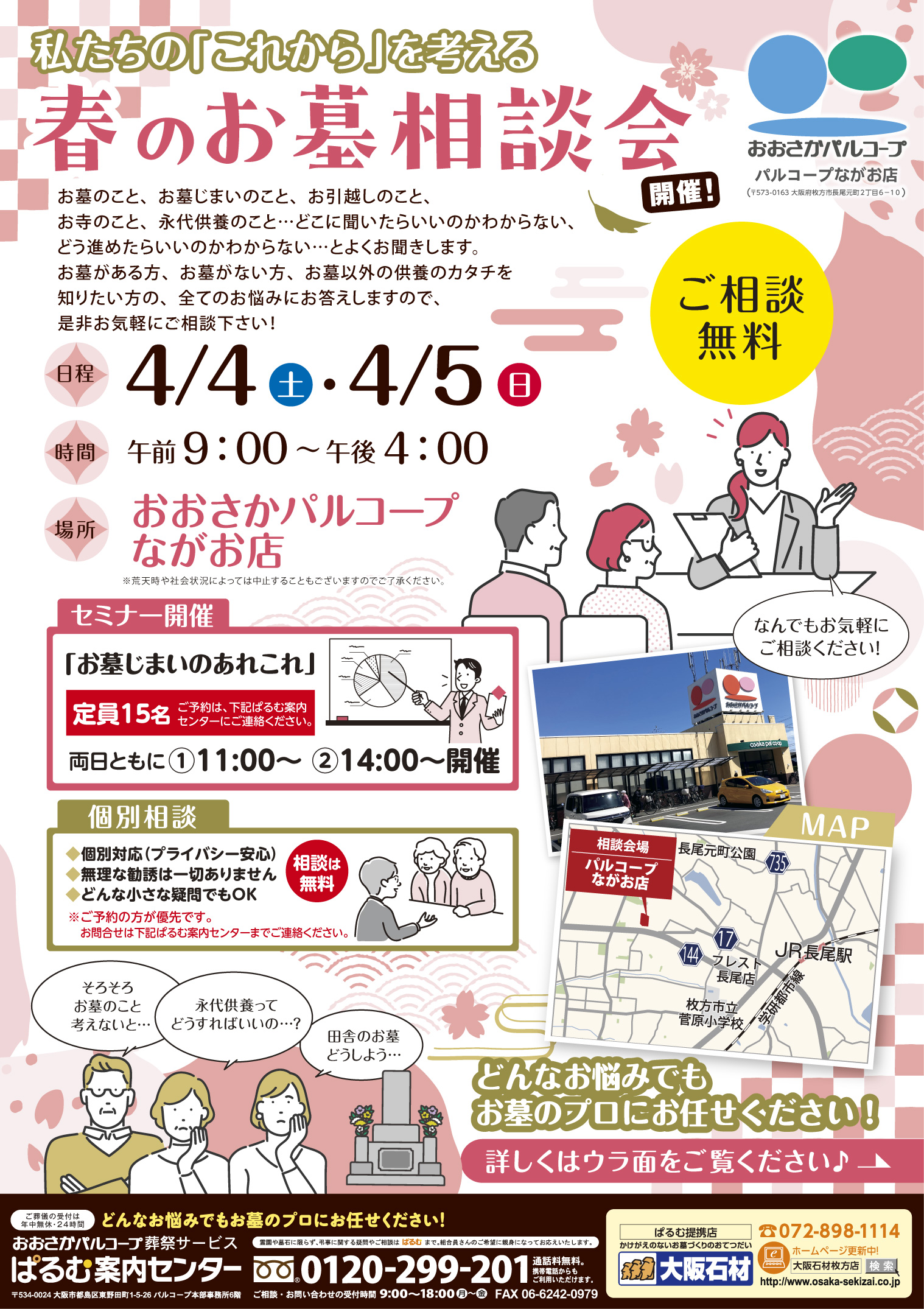【4月4日・5日】おおさかパルコープ主催「春のお墓相談会」に参加させていただいております - 大阪石材|かけがえのないお墓づくりのお手伝い