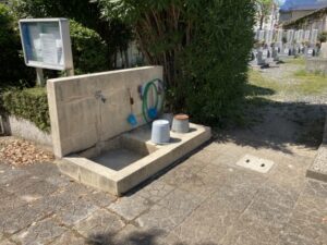 山口霊園にある水場です。その近くに用具倉庫とゴミ捨て場があります。