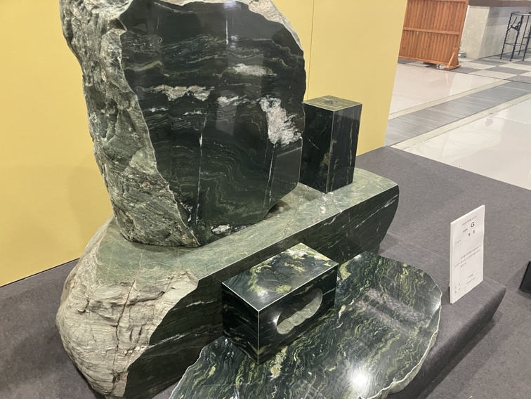 庵治石の「青みがある」という特徴を利用して、粉末をガラスに混ぜて綺麗な青色のグラスを販売していたり、特徴的な斑模様をエクステリアに応用するなど工夫を凝らした製品も展示されていて見ごたえがありました。
