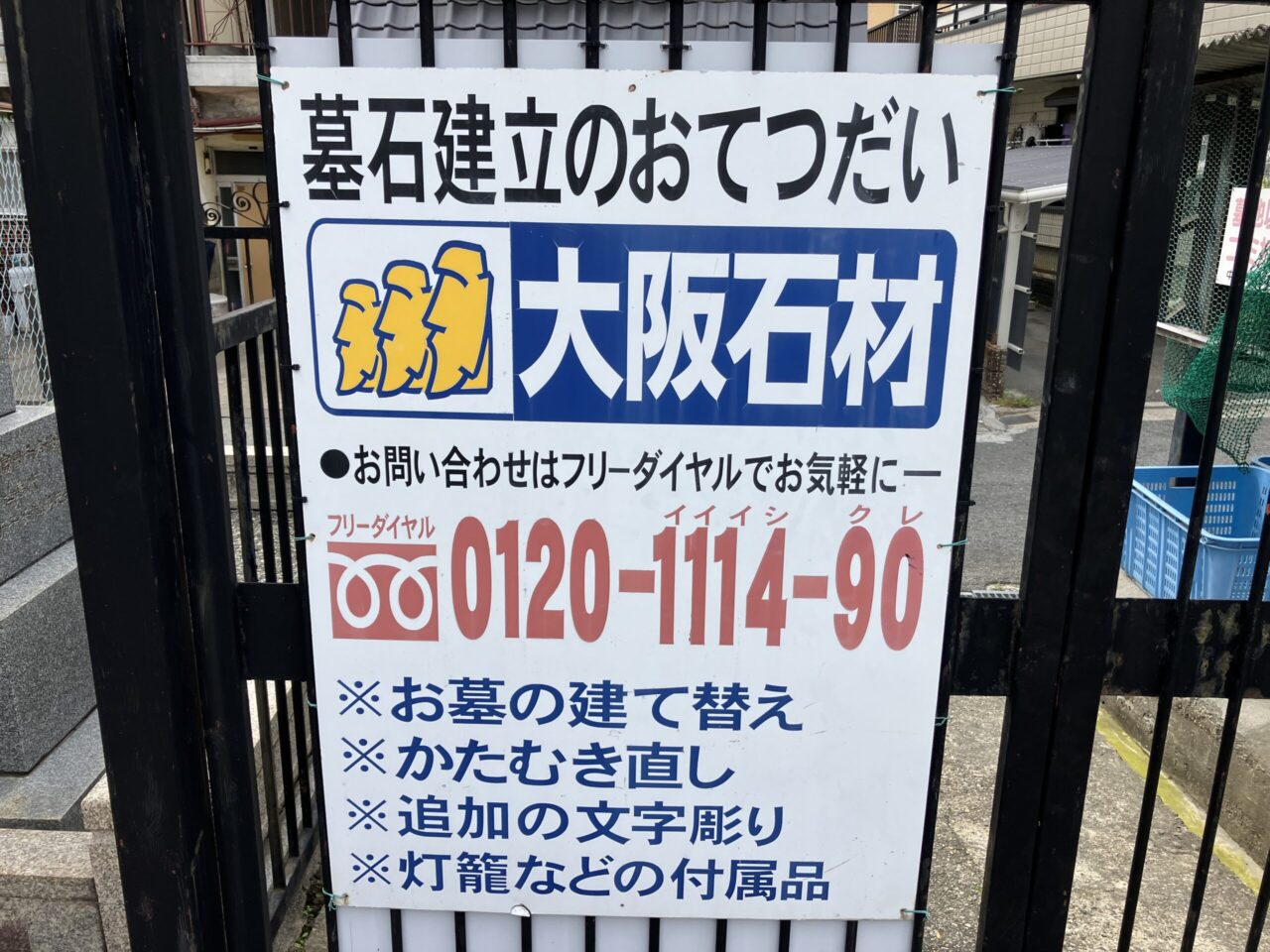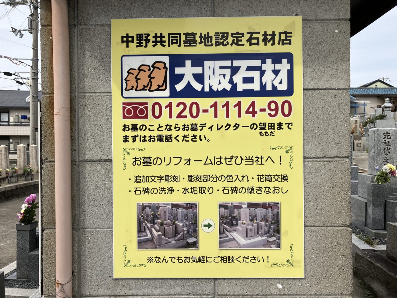 中野共同墓地内では、指定石材店として大阪石材の看板を2か所掲載しています。