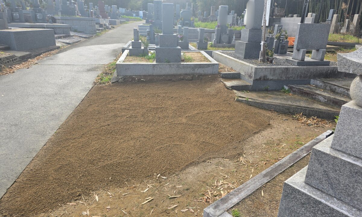 市営墓地・共同墓地の場合は大体の場合更地で返還する必要があるので、仕上げとして真砂土を敷きます。