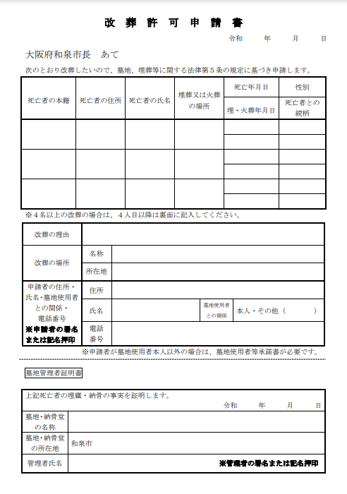 和泉市の「改葬許可申請書」⇩