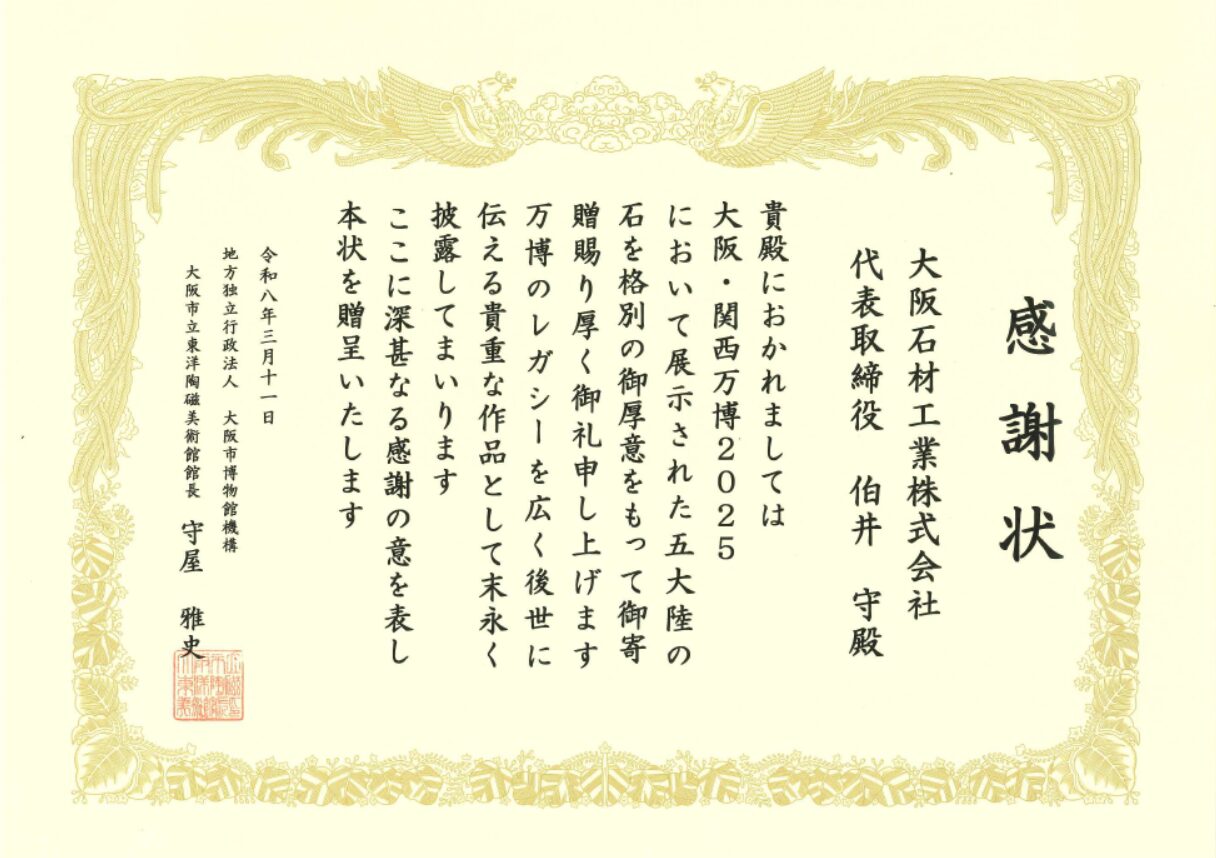 【東洋陶磁美術館】大阪・関西万博「Love stone project」で磨いた石を寄贈させていただきました! - 大阪石材|かけがえのないお墓づくりのお手伝い