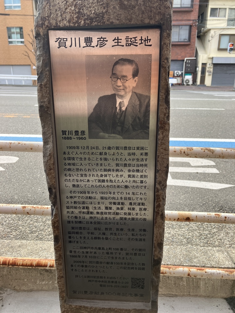 賀川豊彦氏は「スラム街の聖者」とも呼ばれた明治・大正・昭和のキリスト教社会運動家で、貧しい人々を助けるため神戸のスラムに住み込み、労働組合・農民運動・生協(コープ)の発展に尽力し、平和運動も世界的に展開された方です。