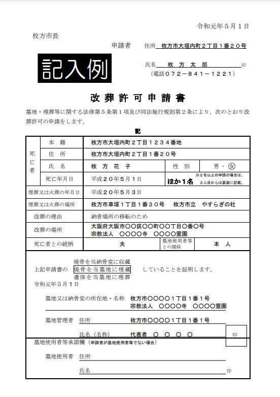 1週間ほどで枚方市役所から「改葬許可証」が交付されます。