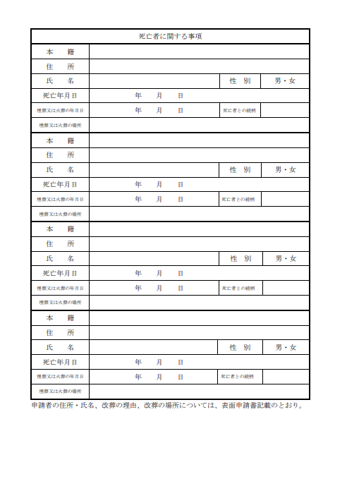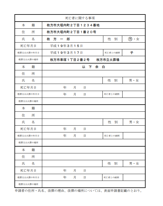 死亡者・申請者・改葬の場所&理由などを記載します。