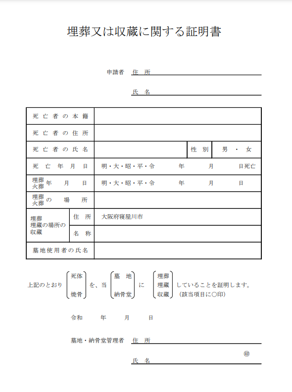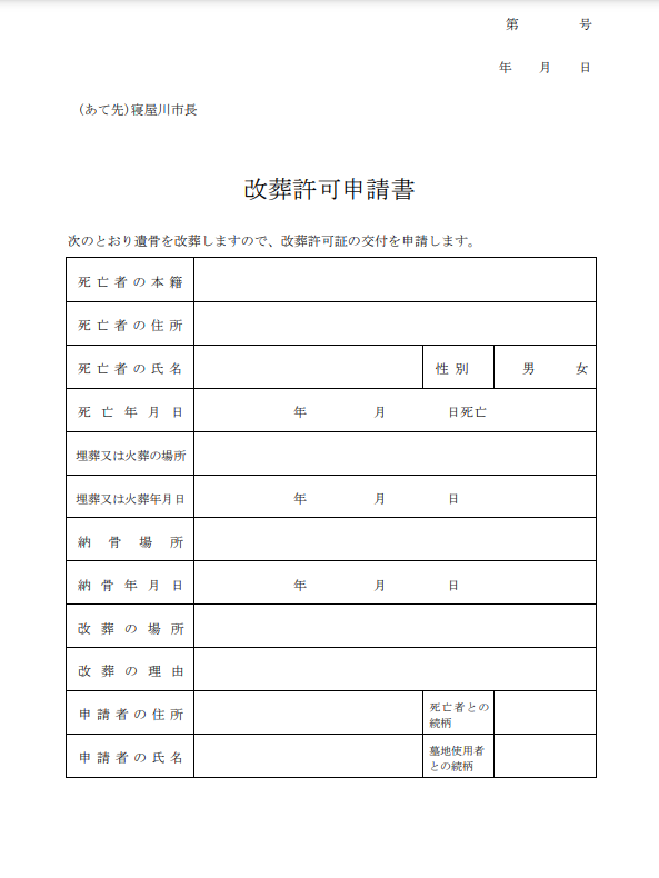 寝屋川市の「改葬許可申請書」⇩