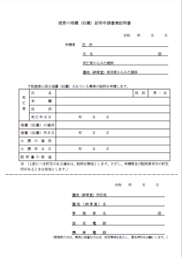 埋蔵証明⇩(墓地によって独自のフォーマットがある場合もございますので、ご注意ください)