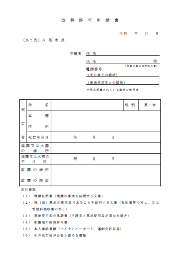 八尾市の「改葬許可申請書」⇩