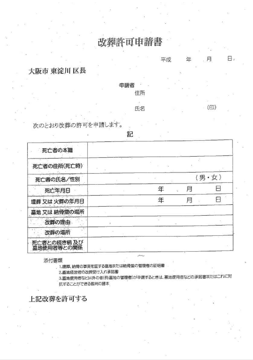 西淀川区役所にて「改葬許可申請書」を取得(市のホームページからはダウンロードできません)