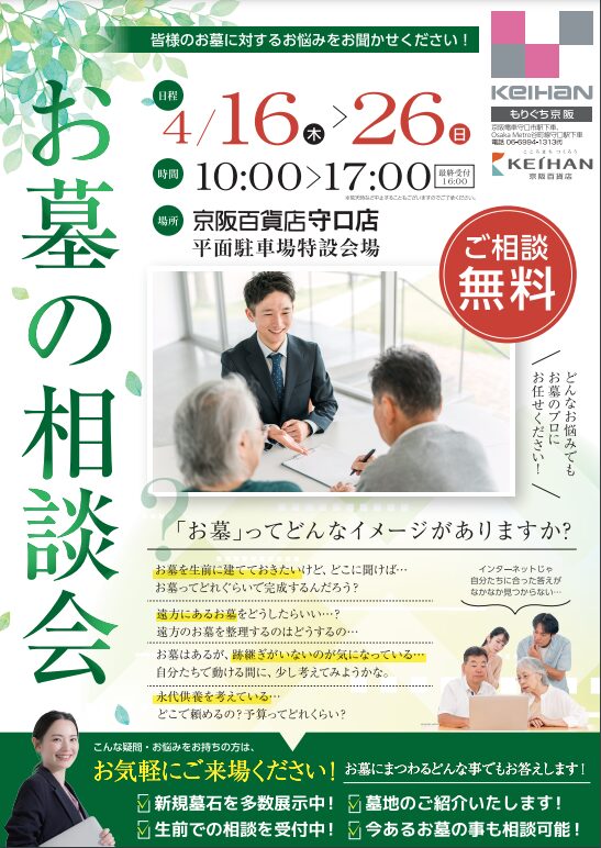 4月16日~26日の間、京阪百貨店守口店様にて「お墓のなんでも相談会」を開催しています。