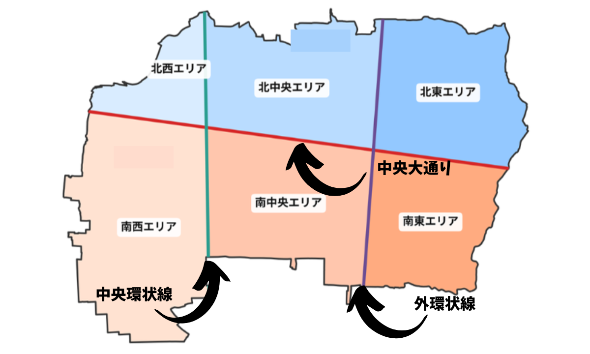 量が多いので、中央大通り・外環・中環で区切って6つのエリアに分類させていただきます。