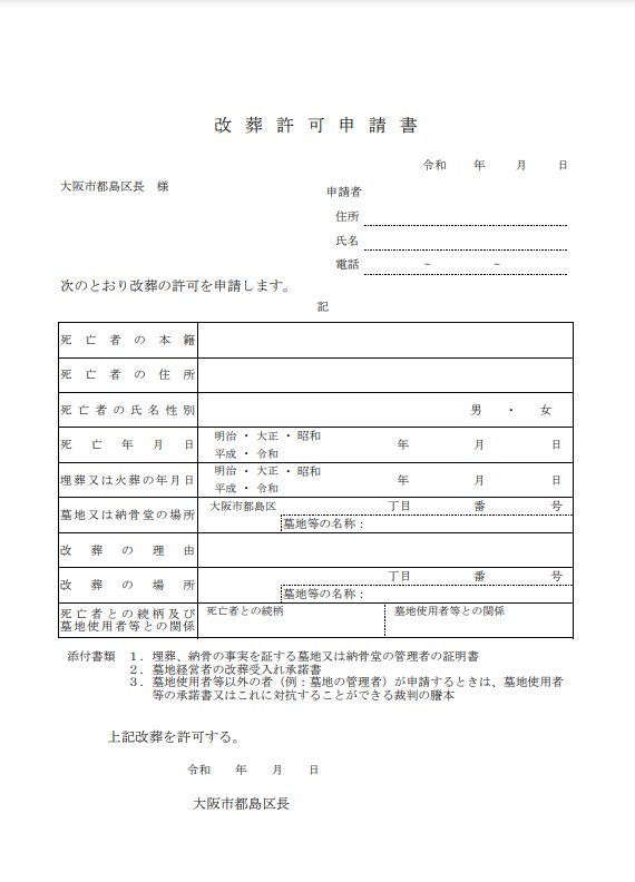 都島区役所にて「改葬許可申請書」を取得(こちらからダウンロード可能です ※市のホームページに飛びます)