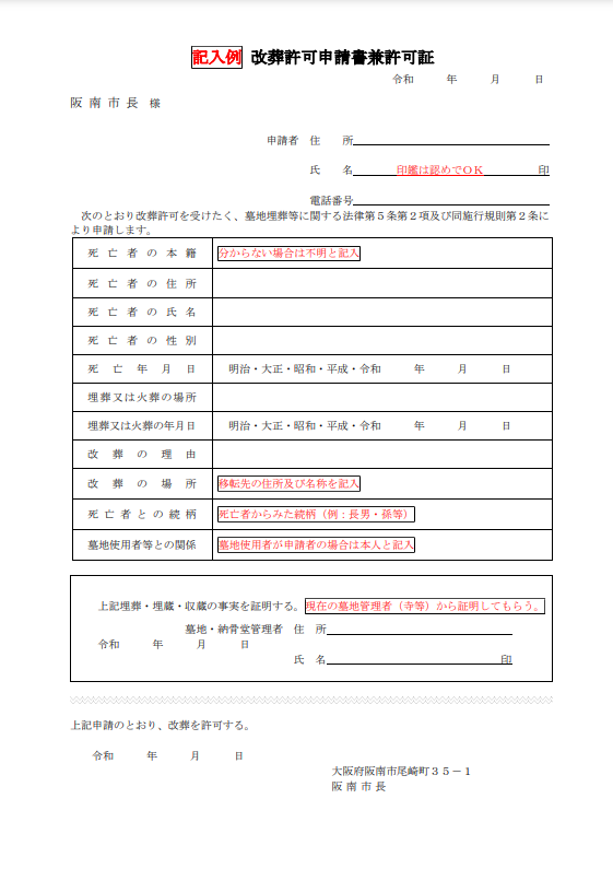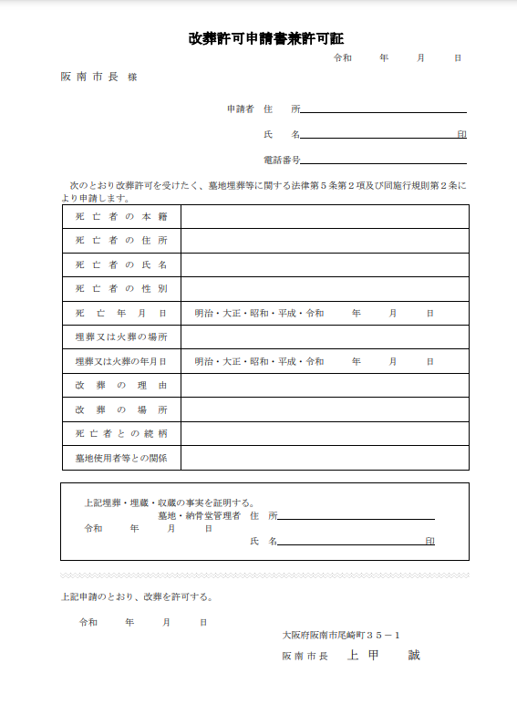 阪南市役所にて「改葬許可申請書」を取得(こちらからダウンロードできます ※市のホームページに飛びます)