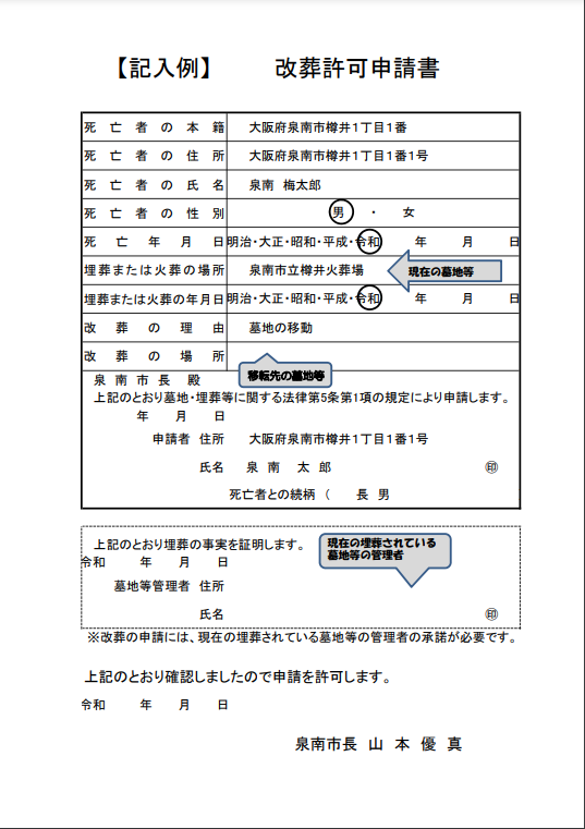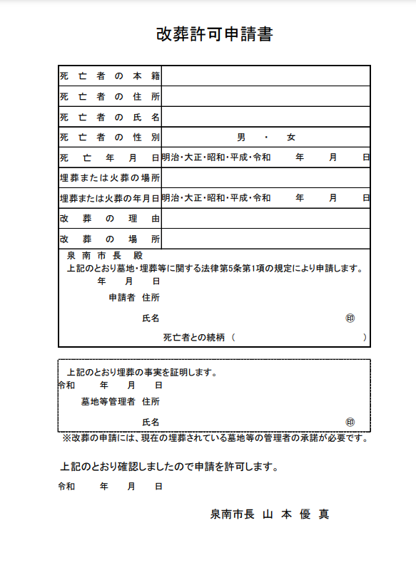泉南市の「改葬許可申請書」⇩