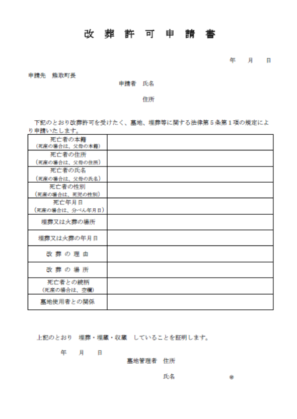 熊取町役所にて「改葬許可申請書」を取得(こちらからダウンロード可能です ※市のホームページに飛びます)