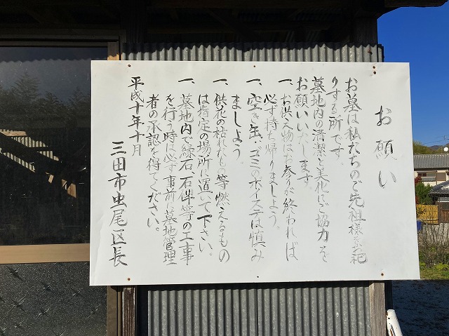 - この墓地は虫尾区が管理し、虫尾区老人会(楽友会)が除草や清掃の奉仕活動を行なっております。