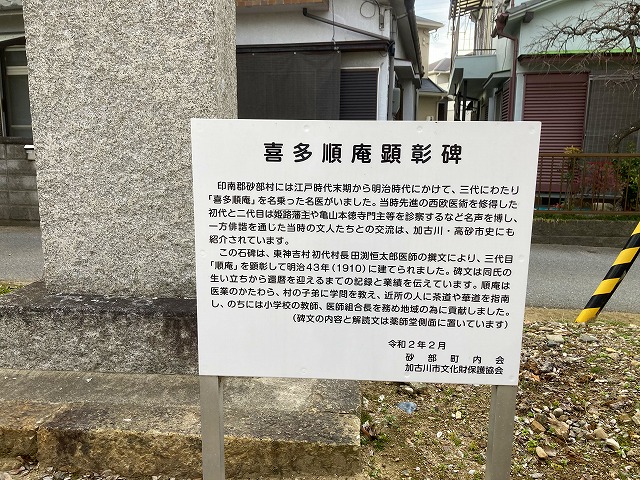 印南郡砂部村には江戸時代末期から明治時代にかけて、三代にわたり「喜多順庵」を名乗った名医がいました。当時先進の西欧医術を習得した初代と二代目は姫路藩主や亀山本徳寺門主等を診察するなど名声を博し、一方俳諧を通じた当時の文人たちとの交流は、加古川・高砂市史にも紹介されています。(一部伐採 碑文の内容と解読文は薬師堂側面に置いています)