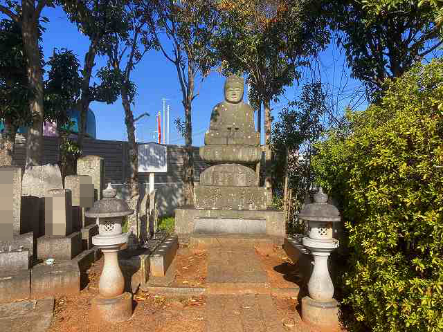 右肩をあらわにした偏袒右肩という納衣の着方をし、両指は阿弥陀如来の印である上品上生(人柄や品質の高尚なことを示す)の印相を結び、結跏趺坐(座禅をしたときの足組)しているこの石仏は、天保二年(一八三一)の建立である。「和泉町 油屋嘉兵衛」の他七名の名前が彫られている。姫路市内の丸彫り石仏の中では屈指の大きさを誇る石仏で、極めて貴重なものである。