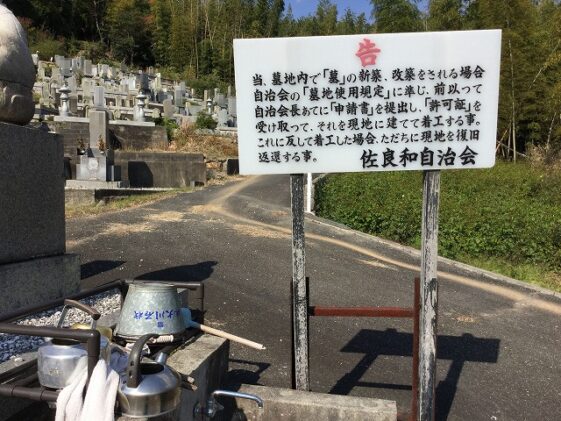 当、墓地内で「墓」の新築、改築をされる場合 自治会の「墓地使用規定」に準じ、前以って自治会長あてに「申請書」を提出し、「許可証」を受け取って、それを現地に建てて着工する事。これに反して着工した場合、ただちに現地を復旧返還する事。