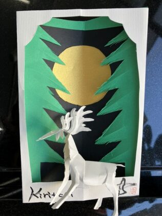 その後、展示館にも立ち寄ってくださり、クリスマス作品と来年の干支「馬」の作品を切っていただきました。