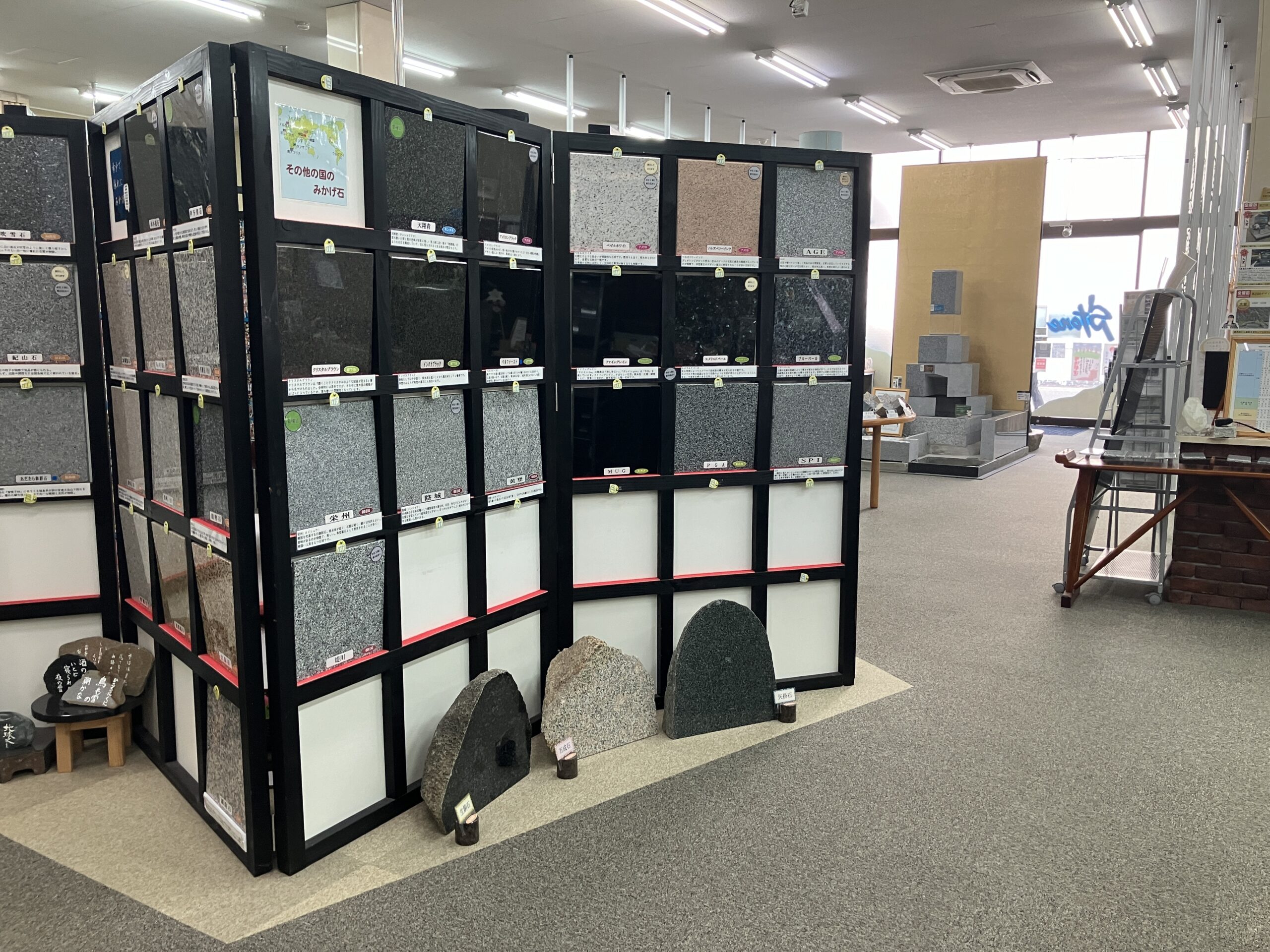 「お墓の展示館」では、お墓の現品や仕組みを紹介した見本パネル、国内外問わず様々な石種を用意しており、普段そこまで触れることのないお墓の世界をコミカルに楽しめる施設となっています。