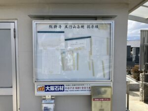 大阪石材としても20年以上前からお仕事をさせていただいており、墓地内には大阪石材の看板がついた掲示板を寄贈させていただいております。