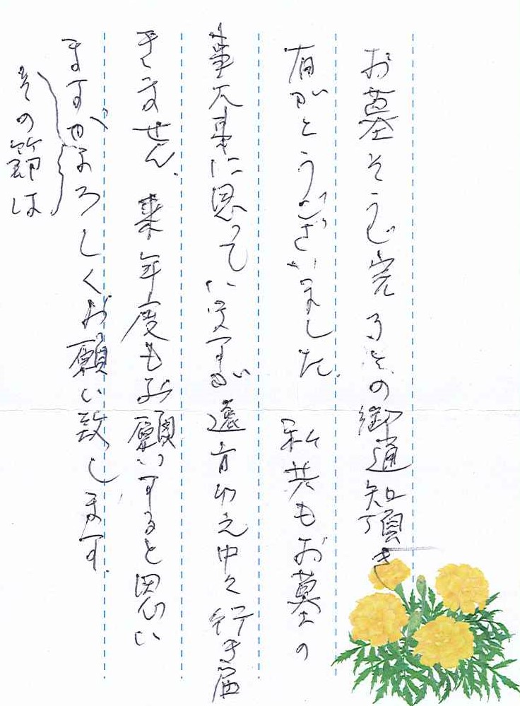 お墓そうじ完了との御通知頂き有がとうございました。