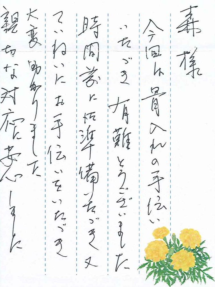 時間前に御準備いただき、又、ていねいにお手伝いをいただき大変助かりました。