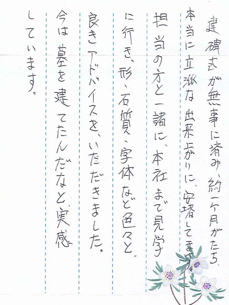 担当の方と一緒に本社まで見学に行き、形・石質・字体など色々と良きアドバイスを