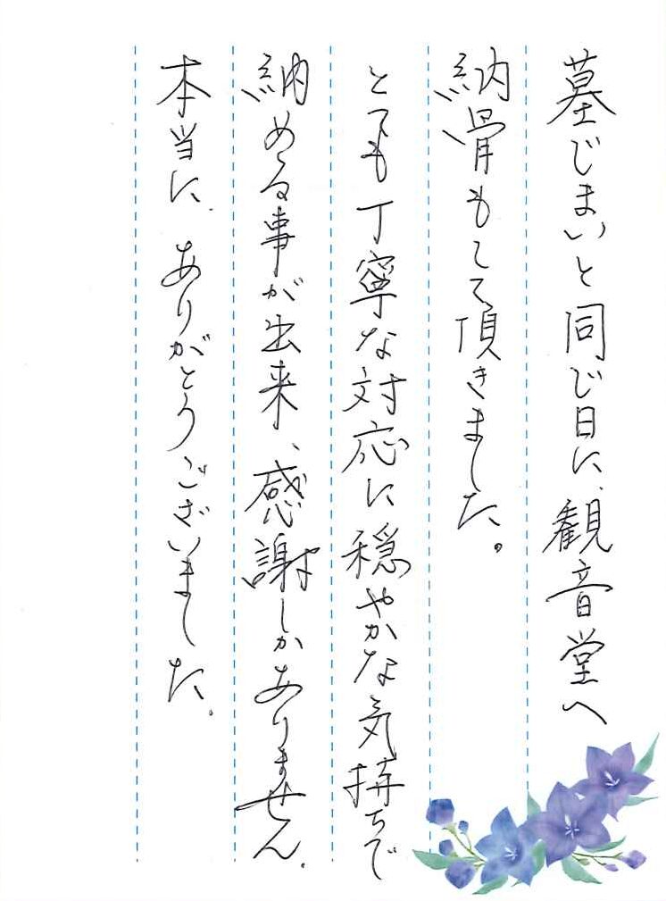 とても丁寧な対応に穏やかな気持ちで納める事が出来、感謝しかありません。