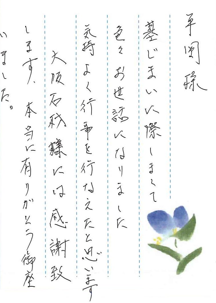 墓じまいに際しまして、色々お世話になりました。気持よく行事を行なえたと思います。