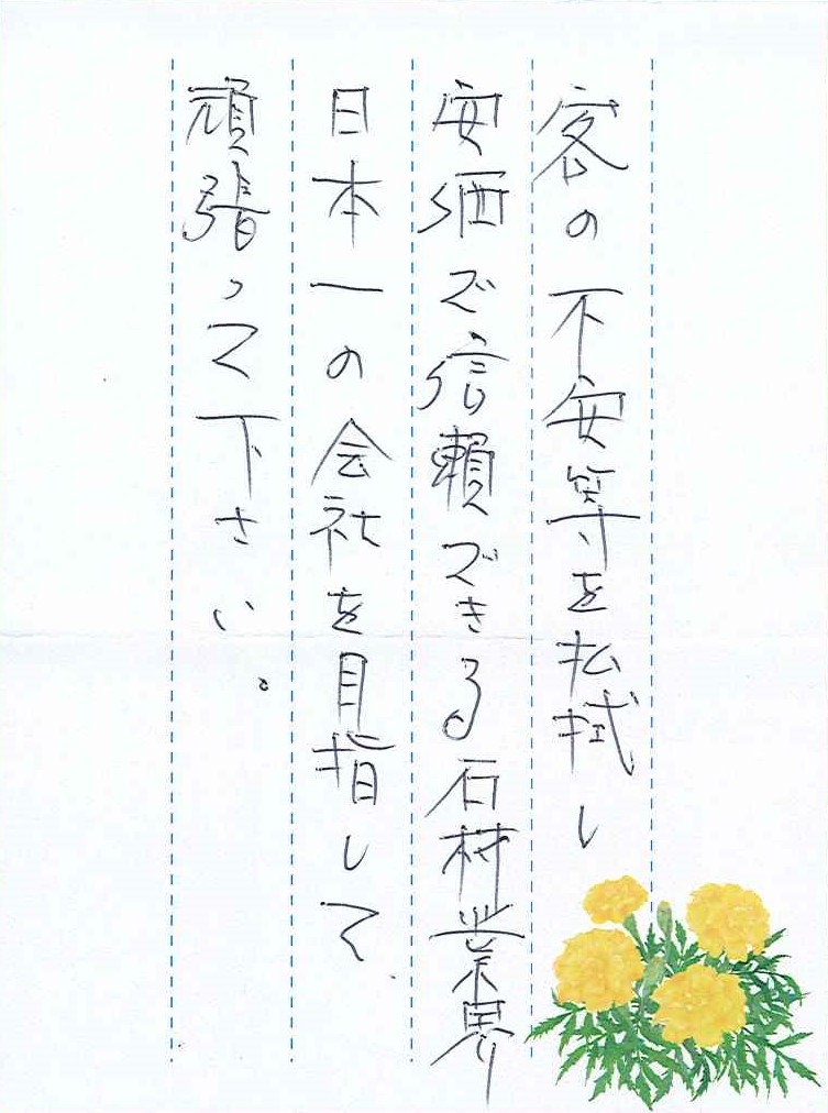客の不安等を払拭し、安価で信頼できる石材業界日本一の会社を目指して頑張って下さい。