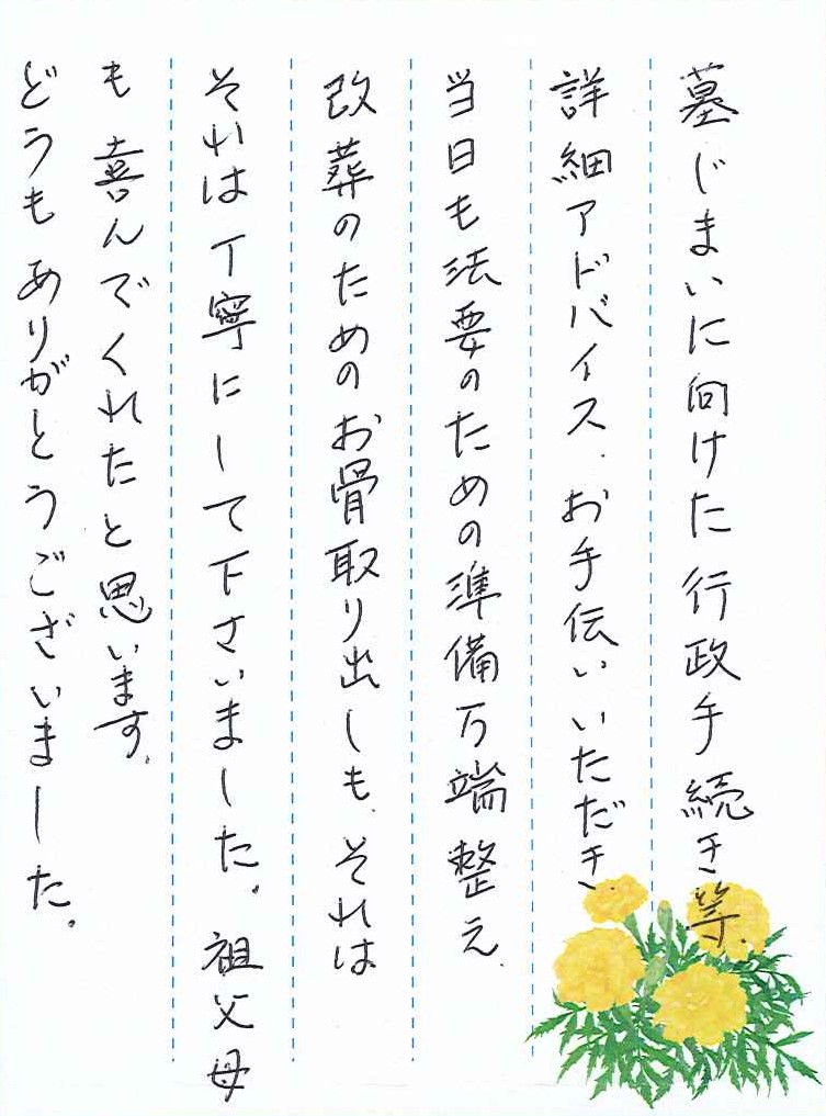 墓じまいに向けた行政手続き等、詳細アドバイスお手伝いいただき、当日も法要のための