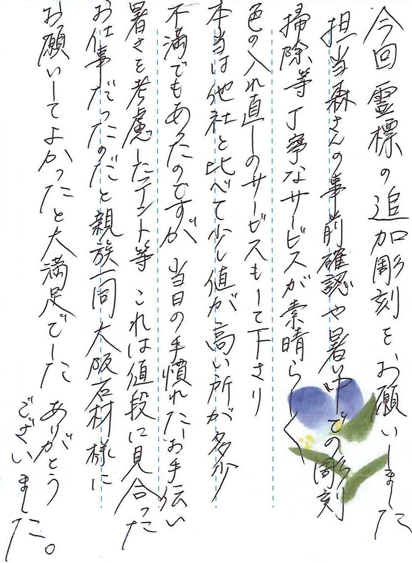 親族一同大阪石材様にお願いしてよかったと大満足でした。ありがとうございました。