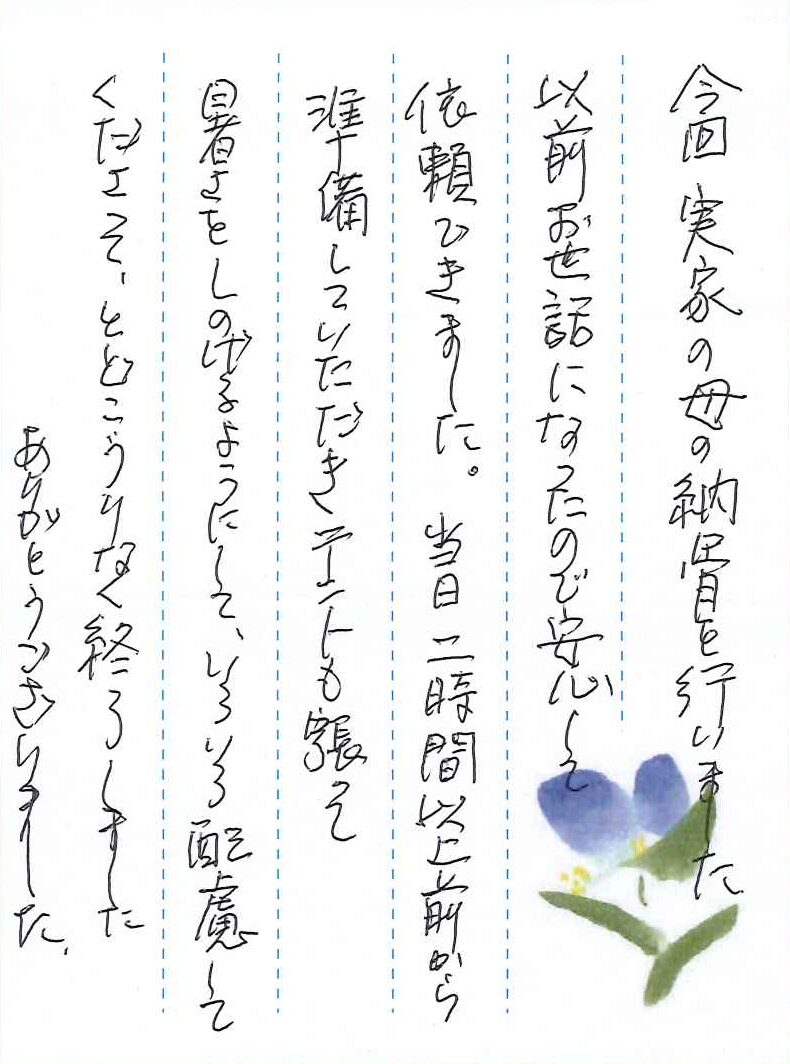 今回実家の母の納骨を行いました。以前お世話になったので安心して依頼できました。