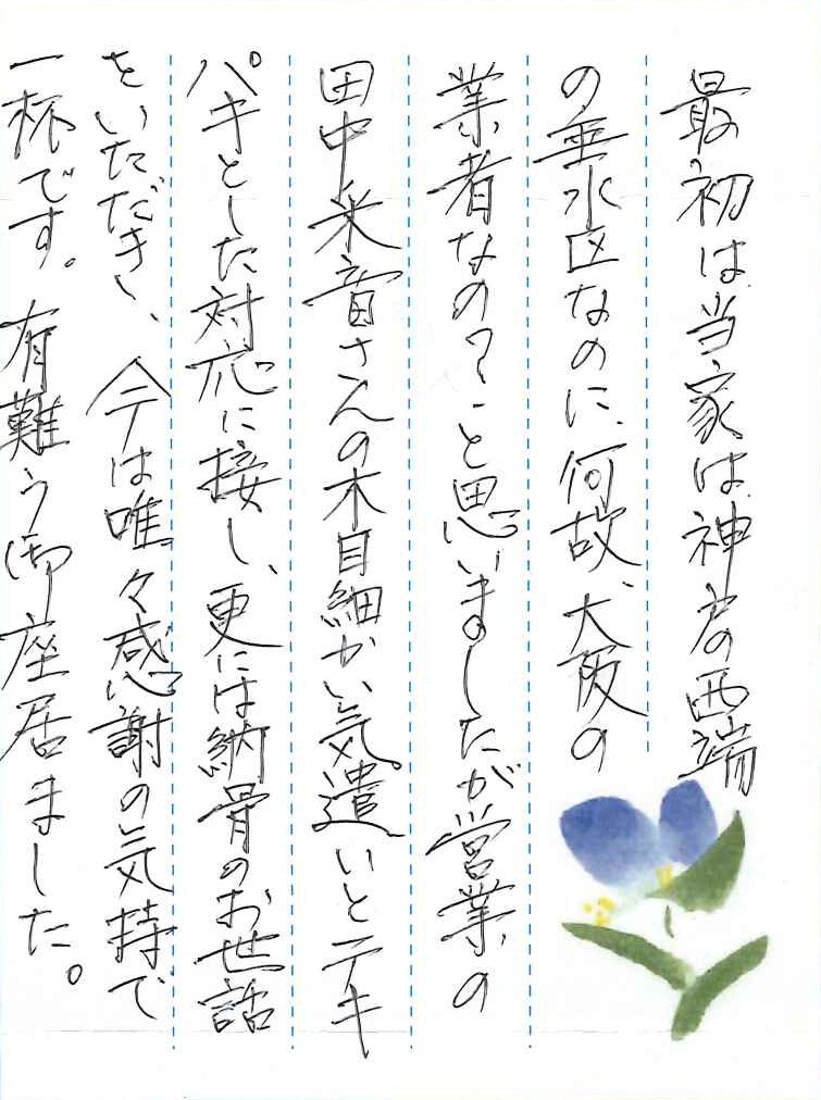 更には納骨のお世話をいただき、今は唯々感謝の気持で一杯です。有難う御座居ました。