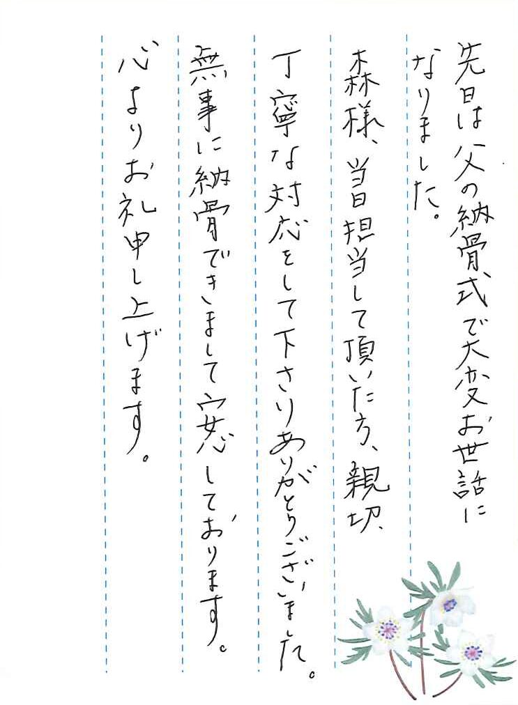 無事に納骨できまして安心しております。心よりお礼申し上げます。