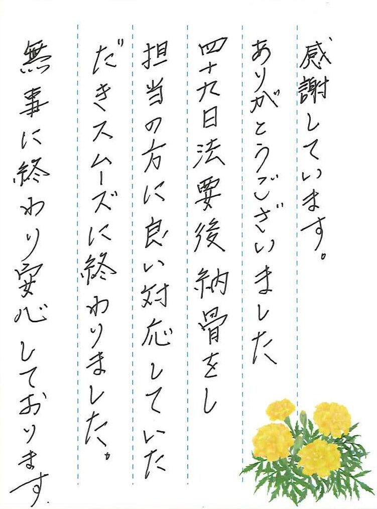 四十九日法要後納骨をし、担当の方に良い対応していただき、スムーズに終わりました。