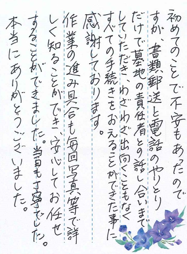 初めてのことで不安もあったのですが、書類郵送と電話のやりとりだけで墓地の責任者との話し