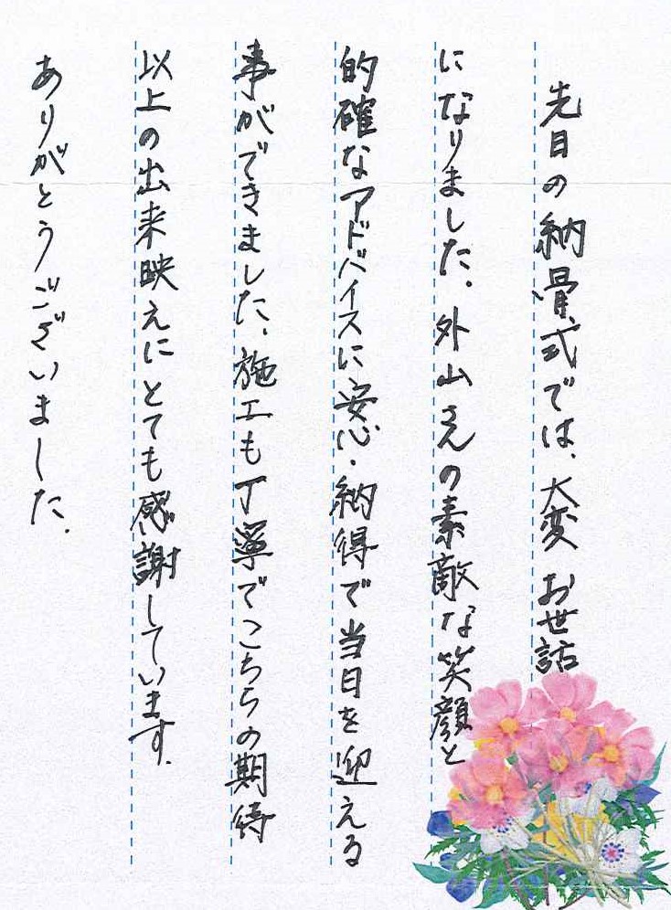 先日の納骨式では、大変お世話になりました。外山さんの素敵な笑顔と