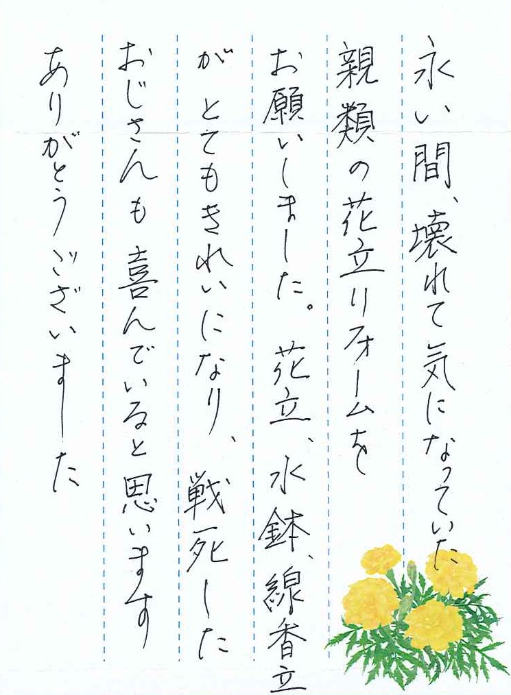 花立、水鉢、線香立がとてもきれいになり、戦死したおじさんも喜んでいると思います。