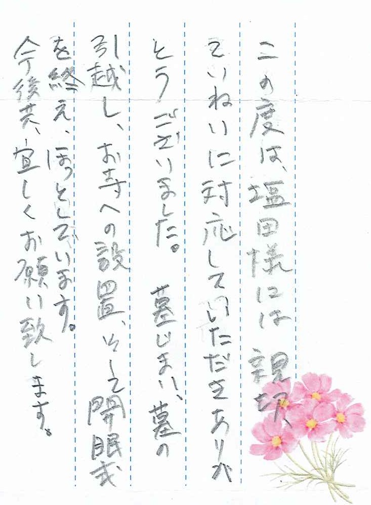 この度は、塩田様には親切ていねいに対応していただき、ありがとうございました。