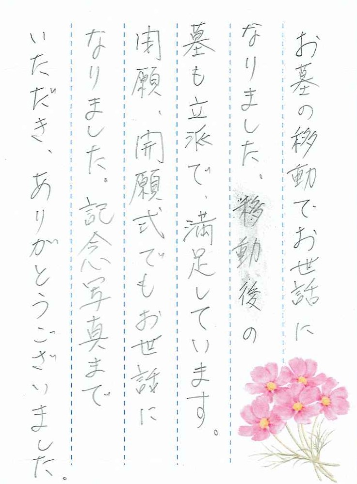 お墓の移動でお世話になりました。移動後の墓も立派で、満足しています。